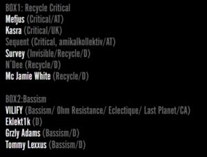 Andy C Ant Miles Bad Company Beasty Boys Berlin Camo & Krooked Congo Natty Culture Shock Danny Bird Dillinja DJ Aphrodite DJ Hype DJ Randall DJ Rap ED Rush Eksman Fabio Grooverider High Contrast J. Majik Köln London Elektricity Madface Maduk MC GQ Moving Fusion Netsky Nu:Logic Optical Pendulum Prisoners of Technology Prodigy Ram Trilogy Rebel MC Renegade Roni Size SASASAS Sniper Sub Focus Top Cat U.T.I. Vocal DNB Wickaman Wilkinson Wuppertal